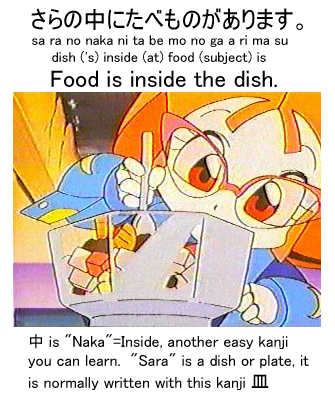 Starting at the top, Ue (Oo-eh) is "on top". And Shita or Sh'ta (Sh-tah) is "Under" or "Beneath". Here's how you can use these words: First, what is it that the item is on top of or under? Lets say a table, Teeburu (Te-eh-boo-roo) in Japanese. Next is the particle no, because it's the table's top or bottom we are talking about, and "no" shows that something belongs to something else. Then the Ue, Shita, or other location words we've learned or are going to learn. The particle ni refers to locations. On top of, under, beside, inside, in front, in back, etc, are all locations. Now, what are we talking about? What is the item? Our subject? Since we're Pizza Cats fans, we'll say there is a Pizza - Piza on top of the table, and a Cat - Neko, under the table. Next the particle ga, to show this is what we are talking about. Finally, "Arimas'", or "Imas'". You've learned "Arimas'" already, "Imas'" is the same thing, but you use it when you are talking about people or animals. Put it all together now: